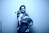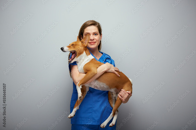 Smiling veterinarian doctor holding yawning dog Isolated portrait.