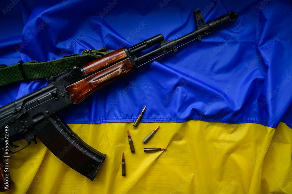 Автоматична нарізна зброя разом із набоями на прапрорі України, як символ свободи та боротьби за демократію.