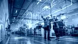 Factory Digitalization: Two Industrial Engineers Use Tablet Computer, Visualize the Wall of Big Data Statistics, Optimization of High-Tech Electronics Facility. Industry 4.0 Machinery Production