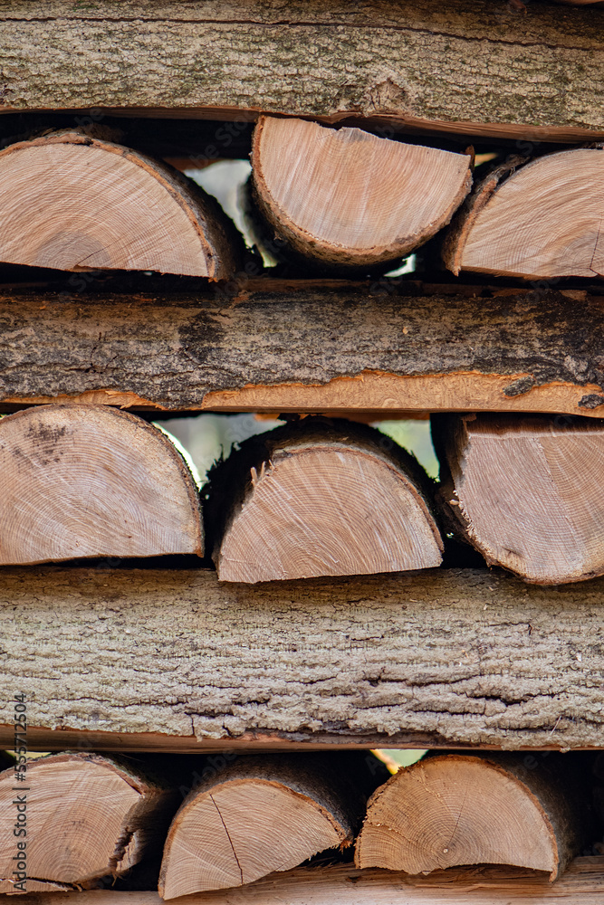 The chopped wood is stacked in a pile.Concept: harvesting firewood for the winter, the beginning of the heating season, eco-friendly fuel.