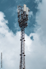 Mobile telecommunication tower or cell tower with antennae and electronic communications equipments on epic cloudscape