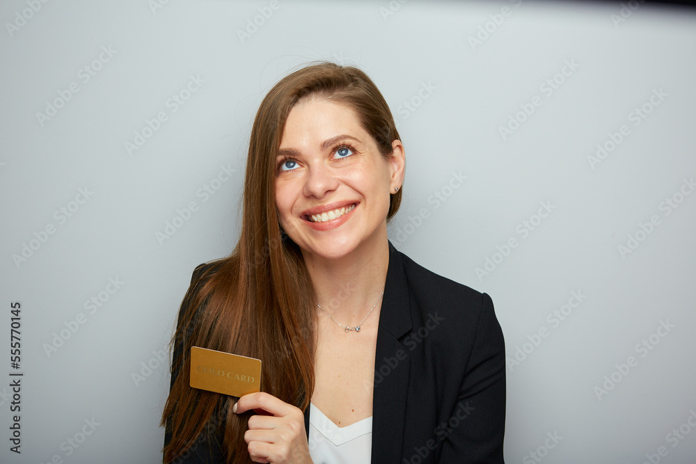 Smiling woman looking up holding credit card wearing black business suit. Isolated female portrait.