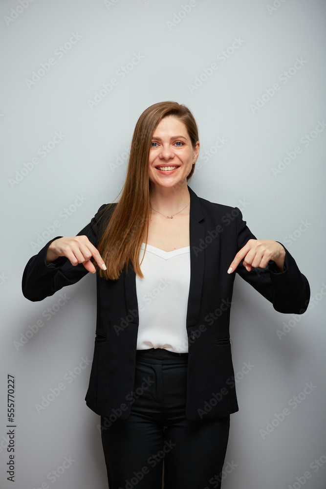 Business woman in black suit pointing fingers down. Isolated portrait female business person.