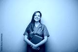 Smiling medical student with book. Isolated portrait of female medical worker.