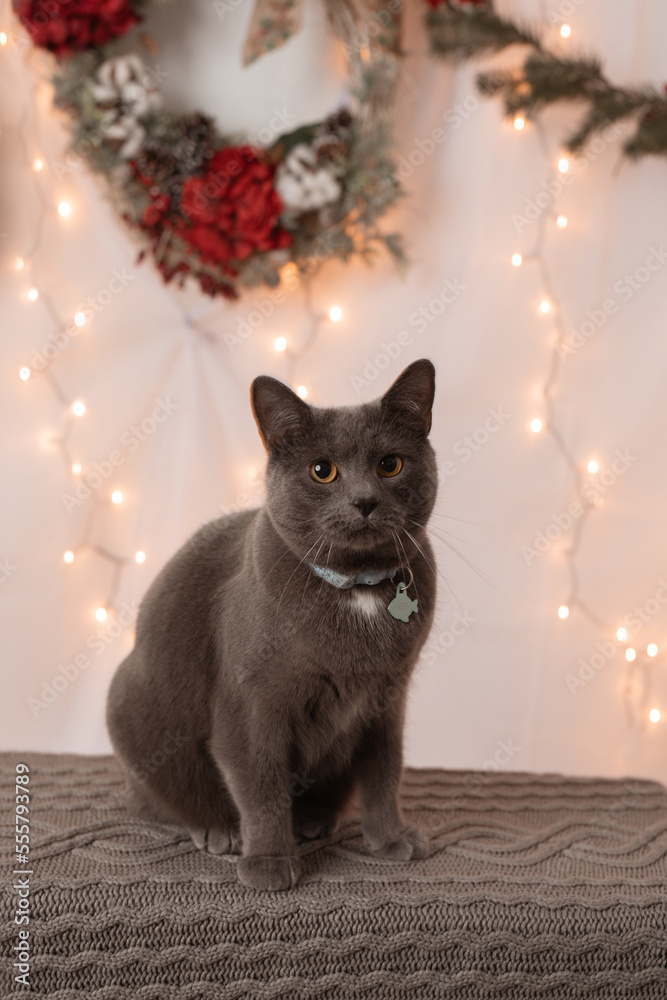 Adorable cat up for adoption in Christmas themed photoshoot.