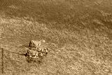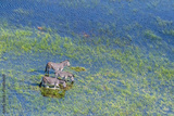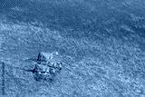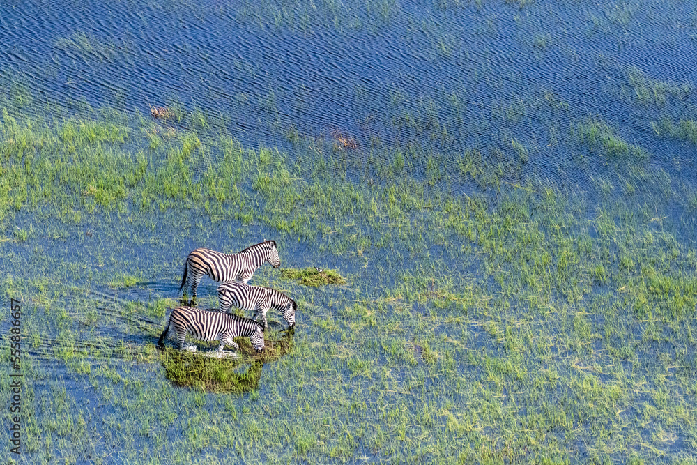 Aerial shot of a group of Zebras, Equus quagga chapmani, grazing in the Okavango delta, Botswana.