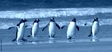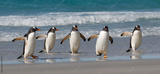 A group of five gentoo penguins walking on a sandy beach. Falkdlands, Antarctica.