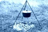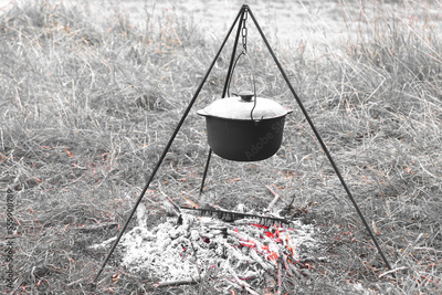 cooking delicious tasty food outdoors on fire in iron pot in summer in good weather with wood from forest