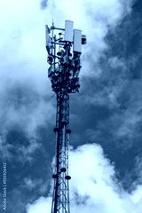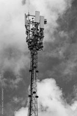 Mobile telecommunication tower with antennae and electronic communications equipments on blue sky with clouds