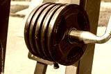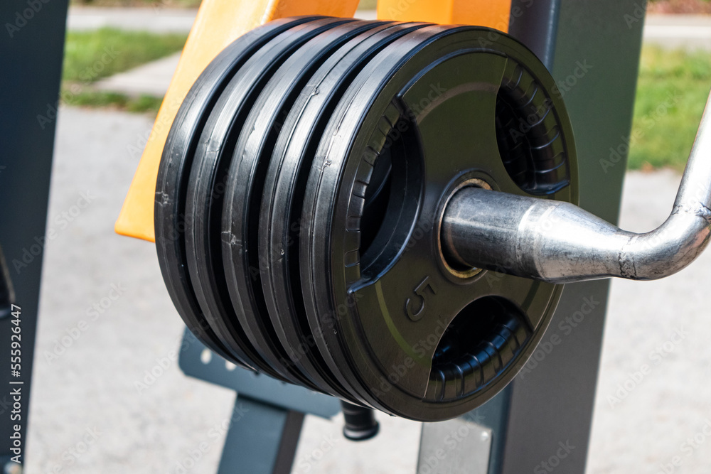 Outdoor sports ground with weight training equipment. Five kilo weights close-up