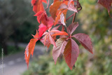 Autumn red grape leaves close-up with blurred background. Autumnal nature details in recreation city park