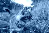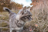Stray fluffy gray cat walking outdoors and exploring autumn forest. Cat portrait in nature with selective focus