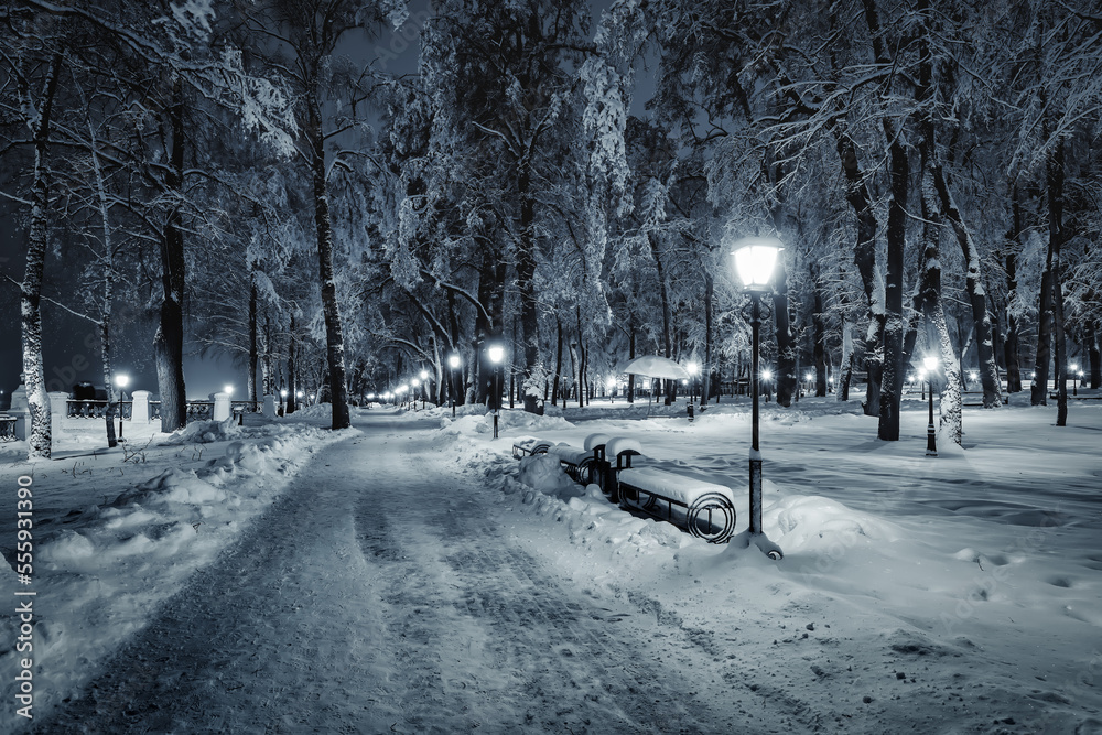 Winter park at night with lights, pavement covered with snow and trees after snowfall.