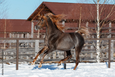 Beautiful arabian chestnut horse running on winter background, portrait in motion