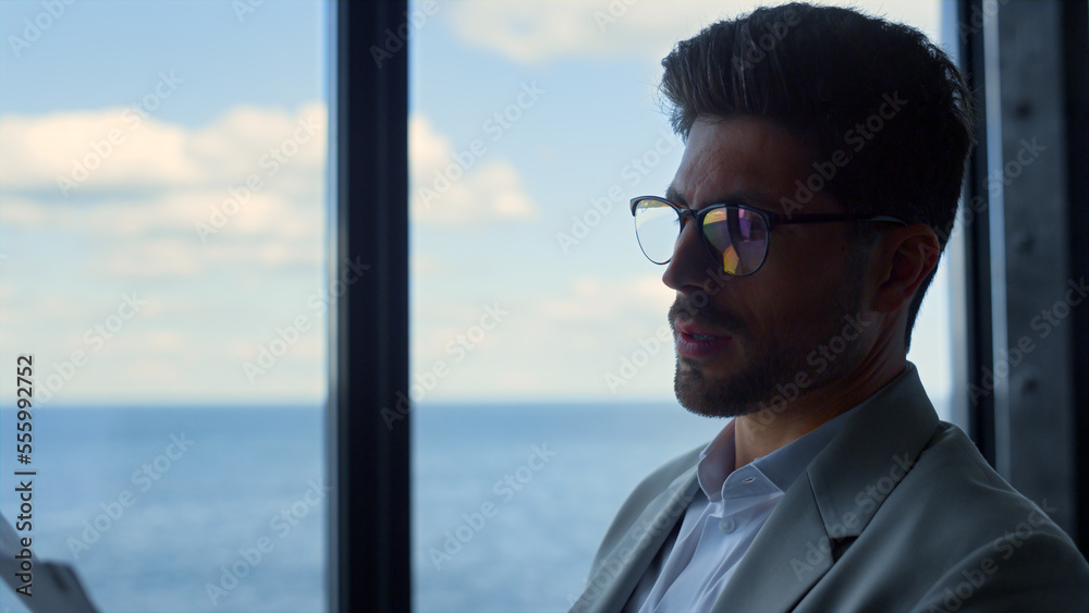 Focused man reading papers at sea panorama window closeup. Lawyer studying deal