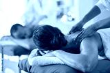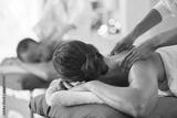 Massage, relax and peace with couple in spa for healing, health and zen treatment. Detox, skincare and beauty with hands of massage therapist on man and woman for calm, physical therapy and luxury