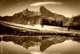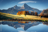 Impressive mountain scenery in the Bavarian Alps. Colorful autumn landscape in the mountains. Watzmann rocky mount reflections in calm alpine lake under sunlight. creative image. Berchtesgaden land