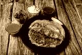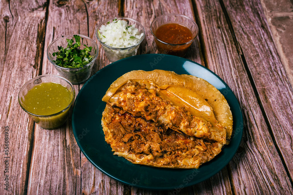 Gringa, typical Mexican dish. Gringa pastor a la diabla served with sauces and other condiments on a wooden table.