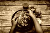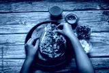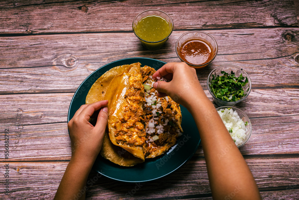 Hands of a person preparing a gringa pastor a la diabla accompanied by sauces and other condiments on a wooden table. Gringa, typical Mexican dish.