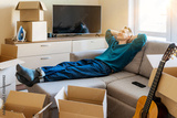 young man lies on a couch in his new purchased apartment. Around the man there are a lot of cardboard boxes with things. Concept of buying new apartment or house