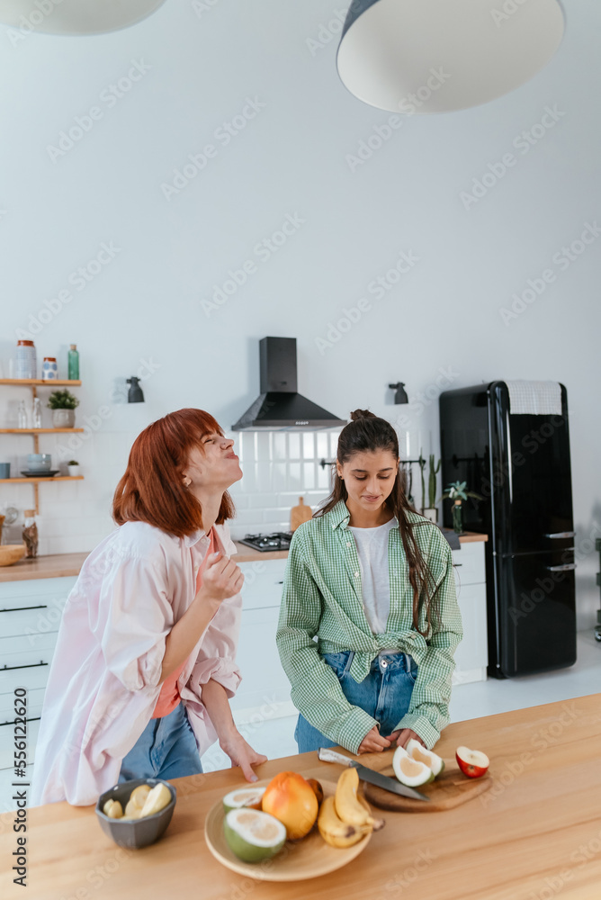 Two girlfriends cut fruit in the kitchen