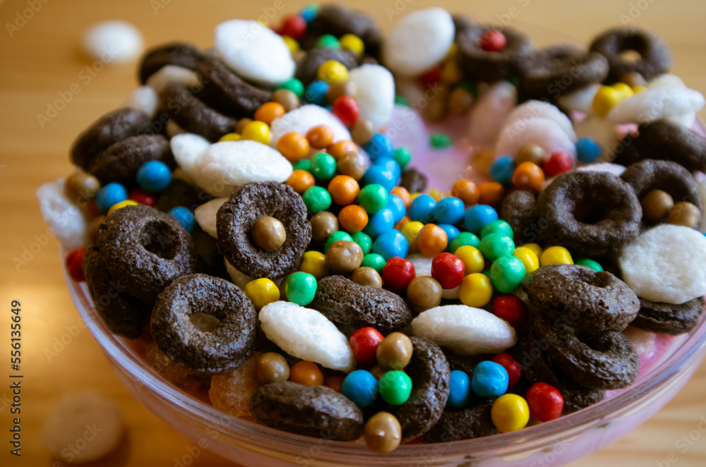 Dry breakfast in round plate bowl. Macro food photo of delicious cornflakes, corn rings. Useful healthy morning brunch for kids, children. Different type cereals, multicolored bright balls flatly.