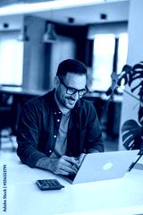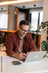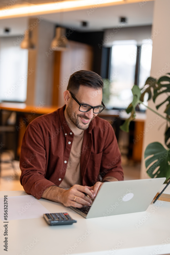 Content young businessman typing on a laptop, writing an e-mail, working and smiling. Surrounded with laptop, paper document and a calculator. Home office concept.