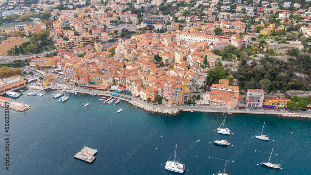 Villefranche, small town in france, French Riviera, Drone view on coast and town