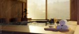 Spa accessories and copy space on Onsen bath in beautiful and relax indoor Japanese Onsen spa room.