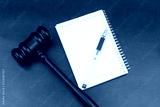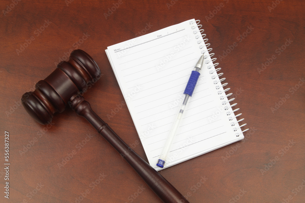 Blank note pad with pen and judge gavel on wooden table. Creating new laws concept.