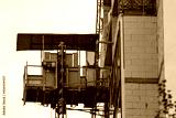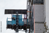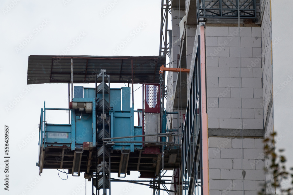 Multistory white brick building construction site close-up details, outdoor facade with lift for workers