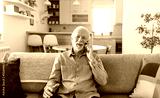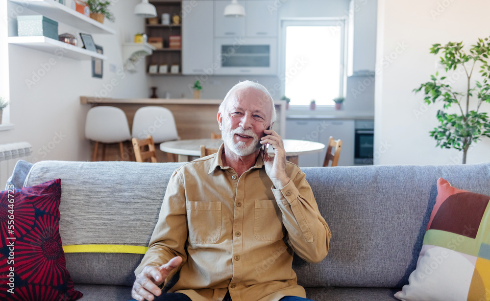 Senior man chatting on a mobile phone while relaxing on a sofa in his living room. Happy senior man talking on phone in the living room.