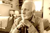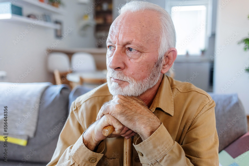 Shot of a senior man sitting alone on the sofa at home and looking contemplative while holding his walking stick