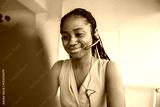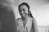 african young woman operator in headphones with microphone with laptop
