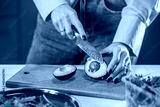 Hostess cuts vegetables and makes salad. Concept of eco-friendly products for cooking. Close up