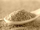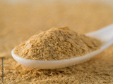 Nutritional yeast background. Nutritional inactive yeast in white spoon. Copy space. Nutritional yeast is vegetarian superfood with cheese flavor, for healthy diet