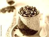 Healthy breakfast concept and idea - two colors chia pudding with organic raw pomegranate, almond and hemp grains. Glass jar with black charcoal and white vegan milk chia pudding. Copy space for text