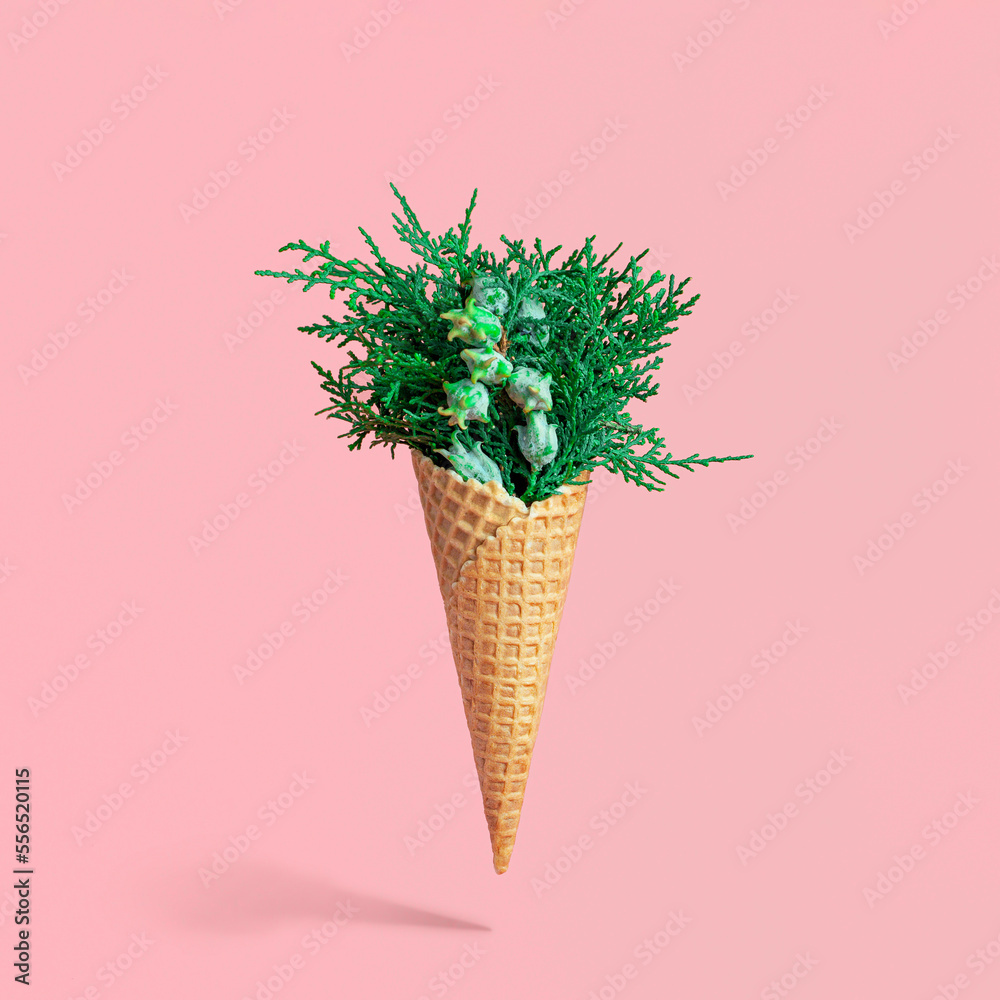 Christmas concept. Bouquet of cypress branches in ice cream cone. Isolated on pink background. Square shape