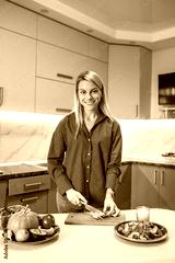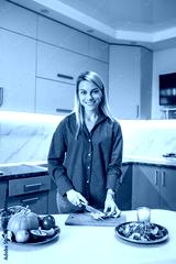 Young adult woman preparing vegetable salad in kitchen. Concept of healthy food, diet and eco food.