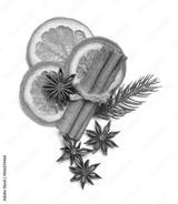 Dry orange slices, fir branch, anise stars and cinnamon sticks isolated on white, top view