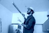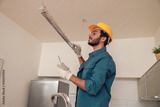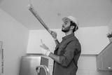 Electrician worker is installing electric lamps light in kitchen. Construction decoration concept
