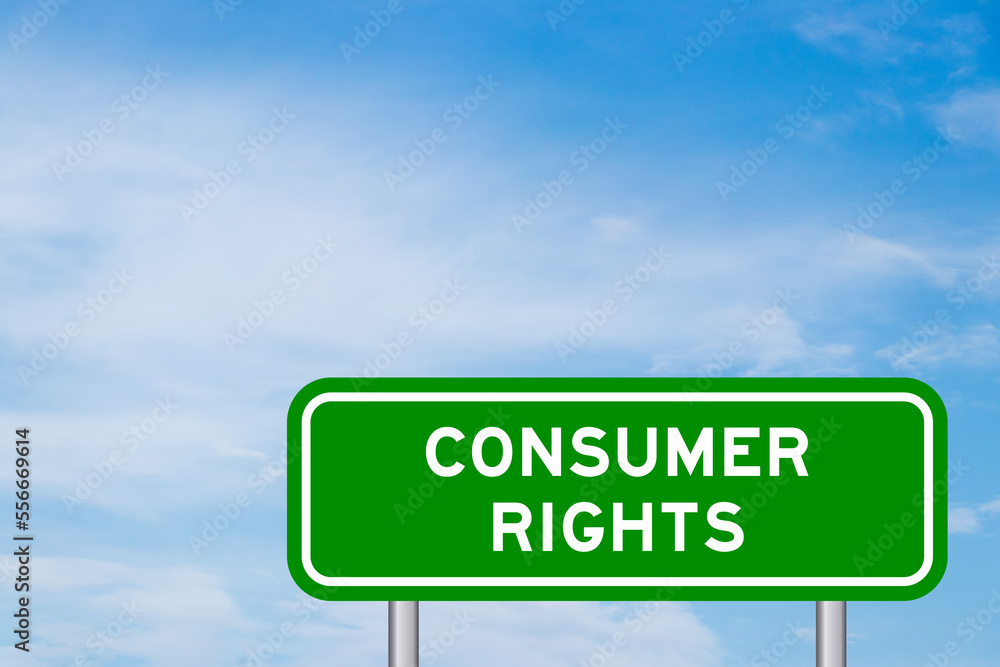 Green color transportation sign with word consumer rights on blue sky with white cloud background