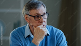 Portrait indoor in office home old thoughtful pensive confused senior man feel worried think memory problem take off glasses forgotten information, elderly old teacher look away anxious about trouble