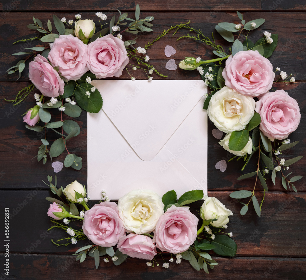 Square Envelope between pink and cream roses on brown wood top view, wedding mockup