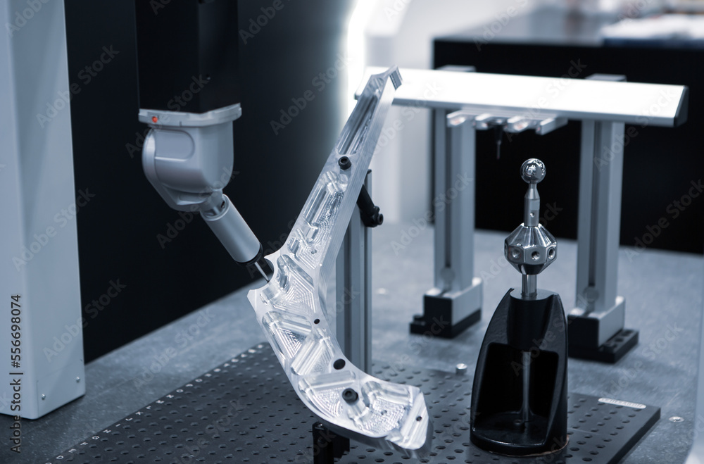 CMM Coordinate Measuring Machine probe measuring workpiece in automotive industry. Industrial manufacture.