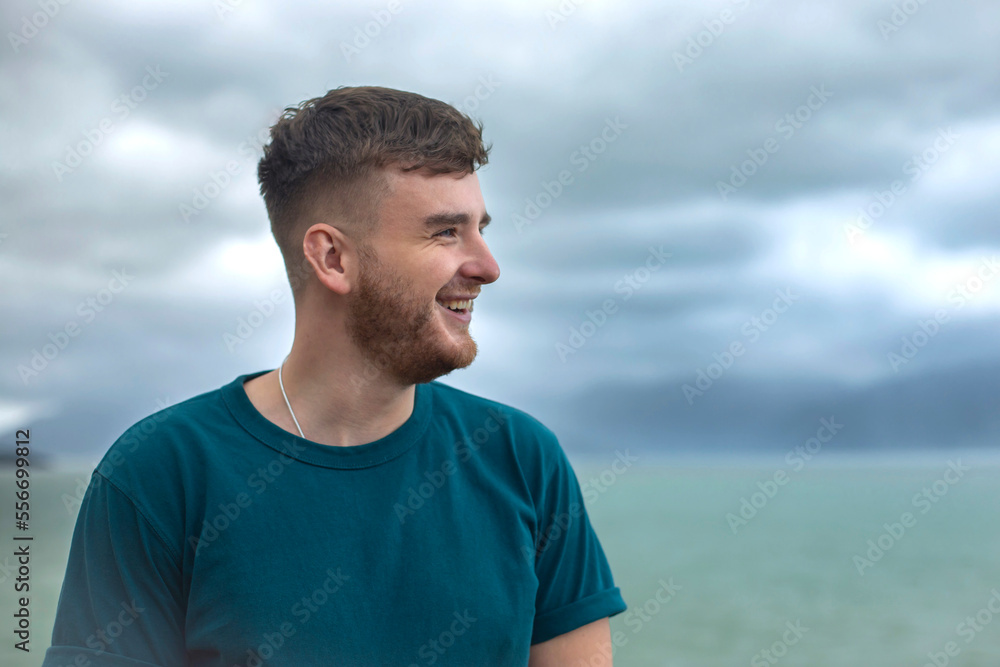 Profile side photo of handsome happy guy, young man enjoying sea, ocean view, landscape, looking into distance at summer day in tropical country at storm with cloudy sky, breathing deep fresh air