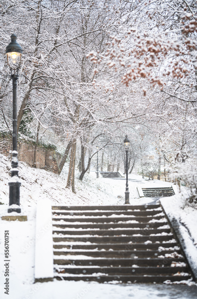 Stairs to the castle of Buda in winter