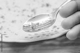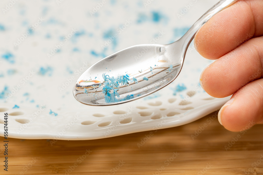 Microplastic in food, Environment and health concept, spoon and plate with plastic particles, Effect of environmental pollution on health
