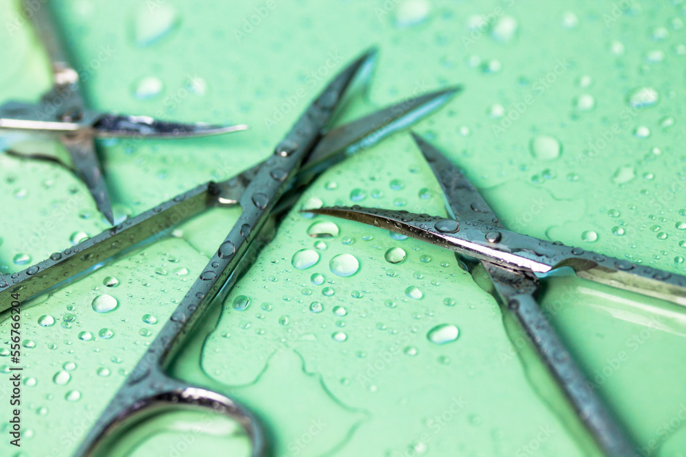 Sharp titanium manicure scissors for trimming cuticles on green background with water drops flatly with copy space. Metal tools for work of manicurist in beauty salon. Nail pedicure, body care concept