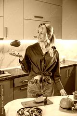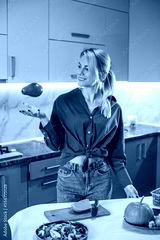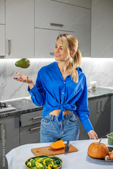 Young adult woman preparing vegetable salad in kitchen. Concept of healthy food, diet and eco food.